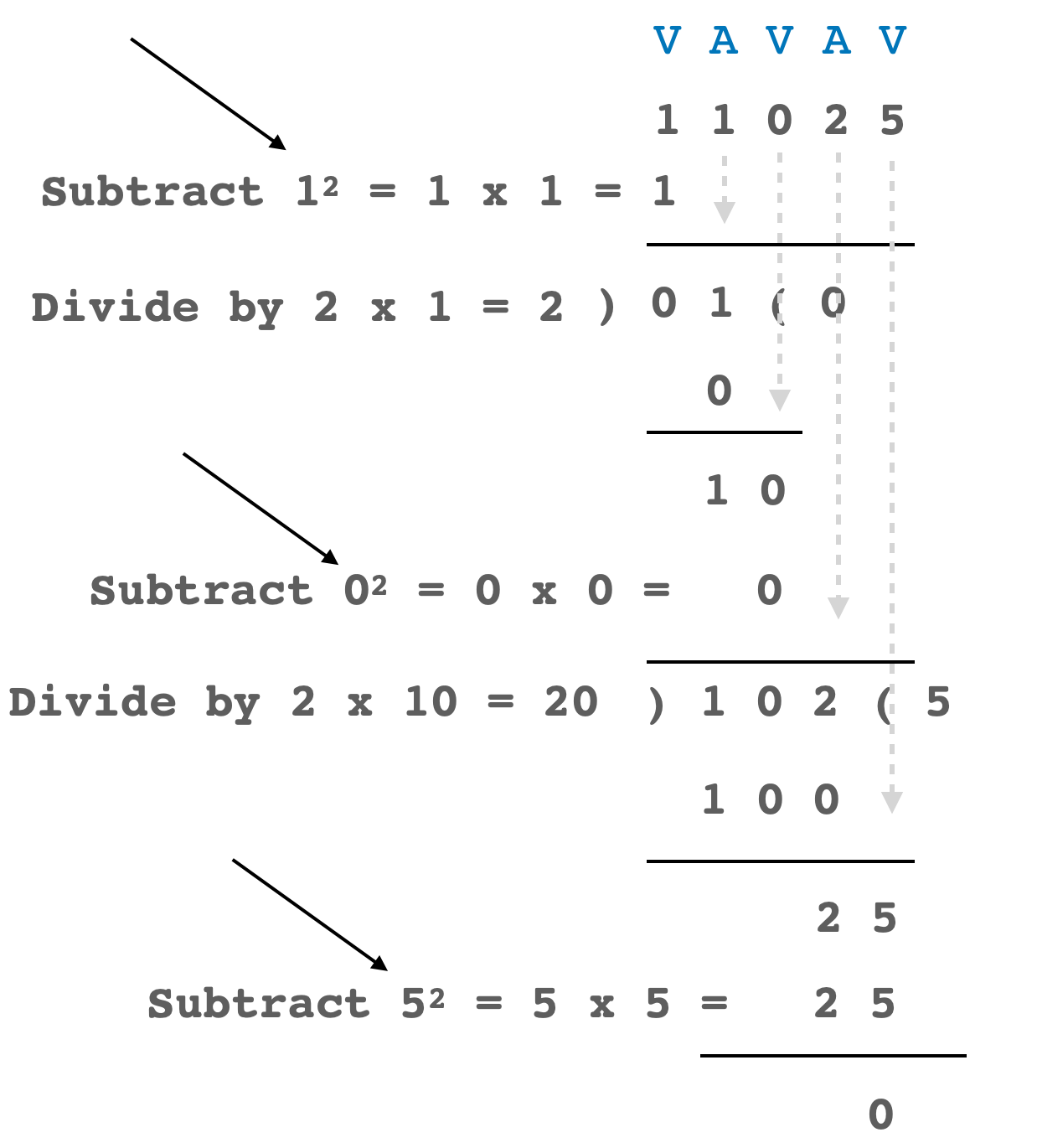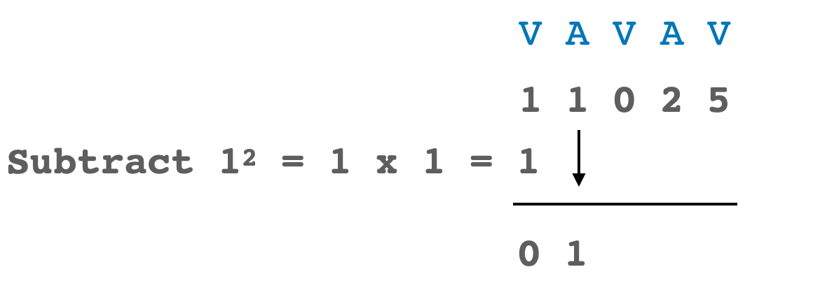 As you can see, we’ve labelled these as varga (square position) and avarga (non square position). The first we have to take the Varga position which will be either one or two digits. In this case it is a single digit of 1. The highest square we can subtract from this is 1.