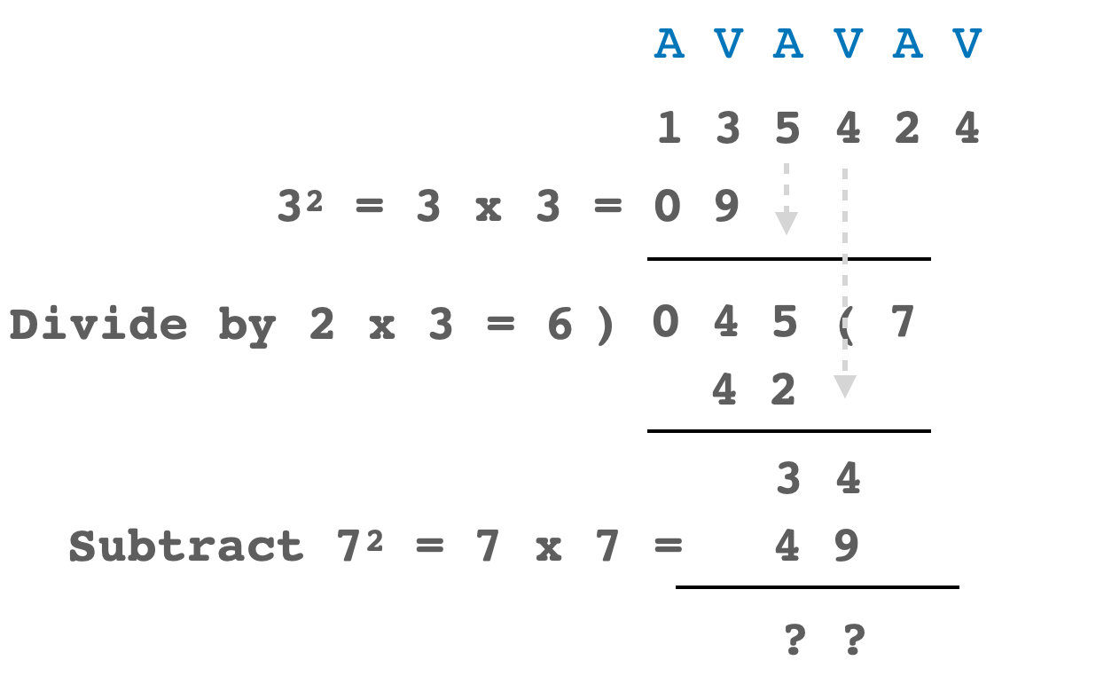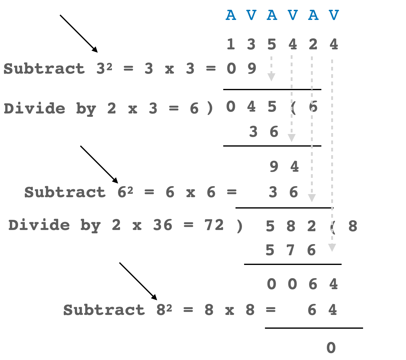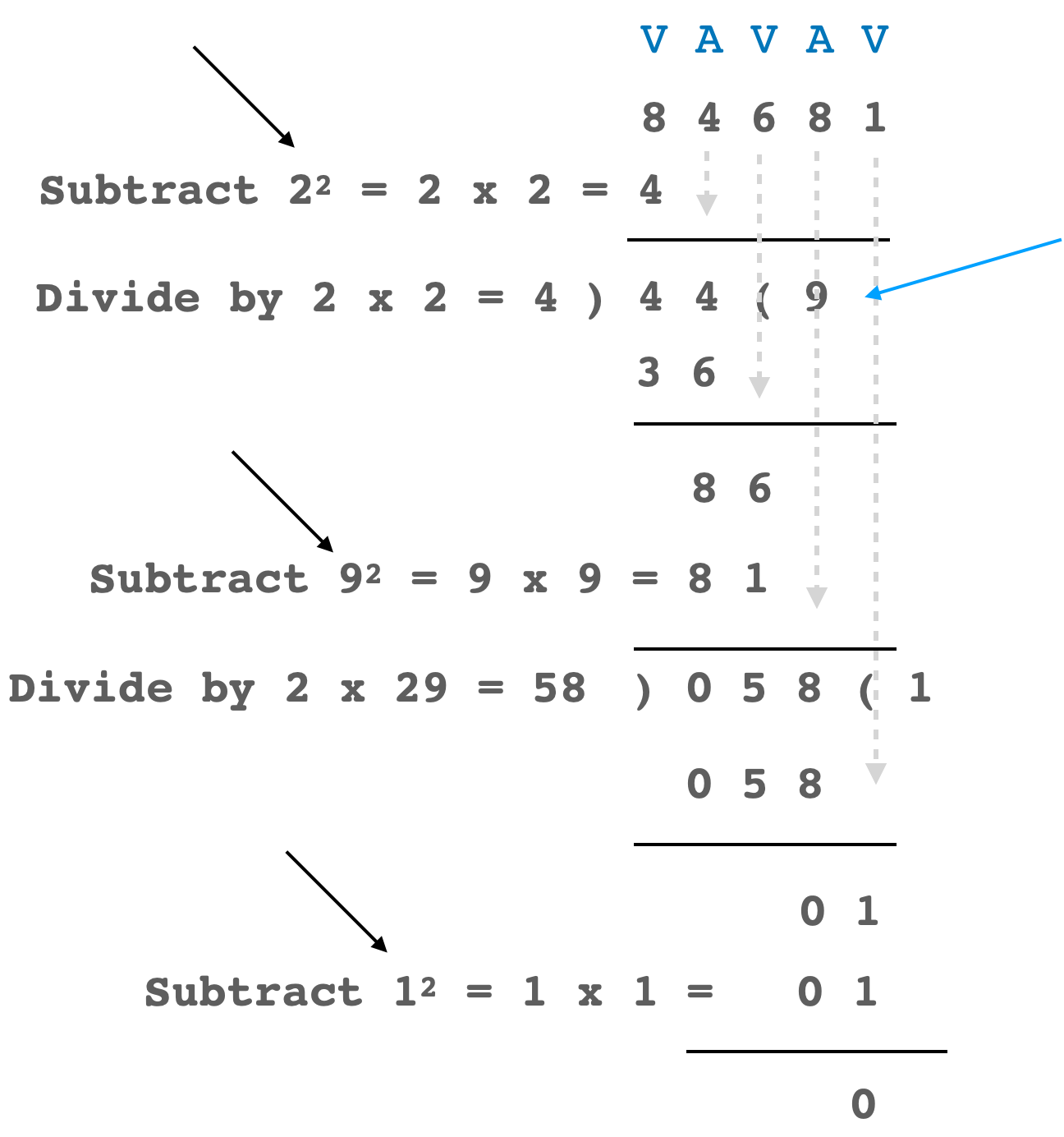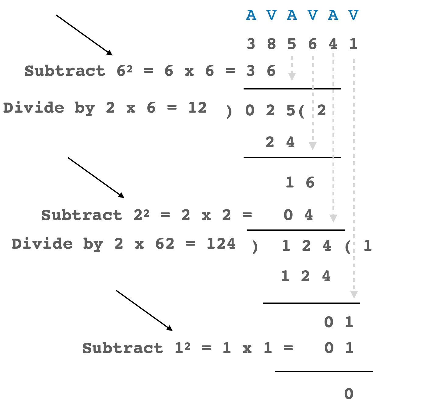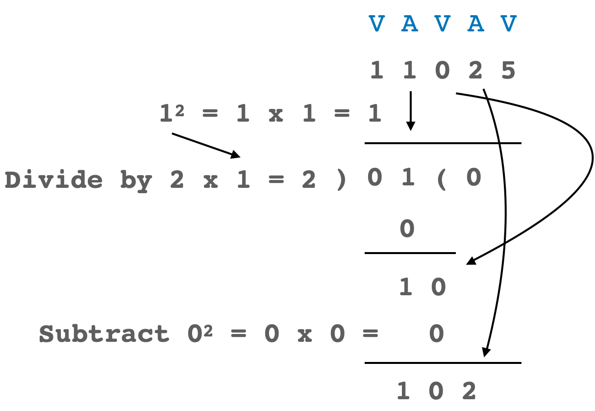 Note: Here we’re lucky as 2 is just bigger so we get zero. In the next step, we’re going to subtract the square of the quotient, so we have to ensure that this square of the quotient subtraction doesn’t create a negative number. There may be backtracking involved here and we may have to reduce the quotient to make this accommodation. That’s what makes this algorithmic.